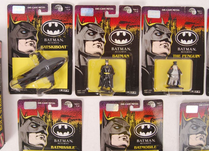 A collection of 9x Batman Returns ERTL diecast models, all carded, unopened. Along with a Toys R Us Limited Edition Kenner made ' Batman Bola Strike ' action figure, unopened / sealed.
