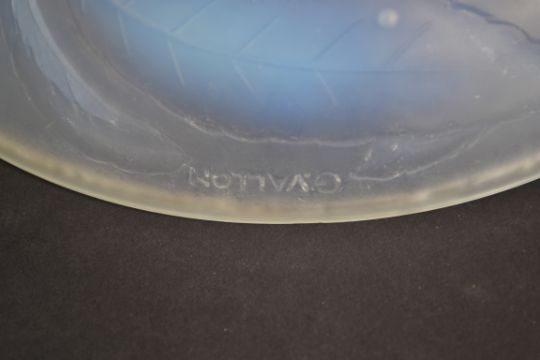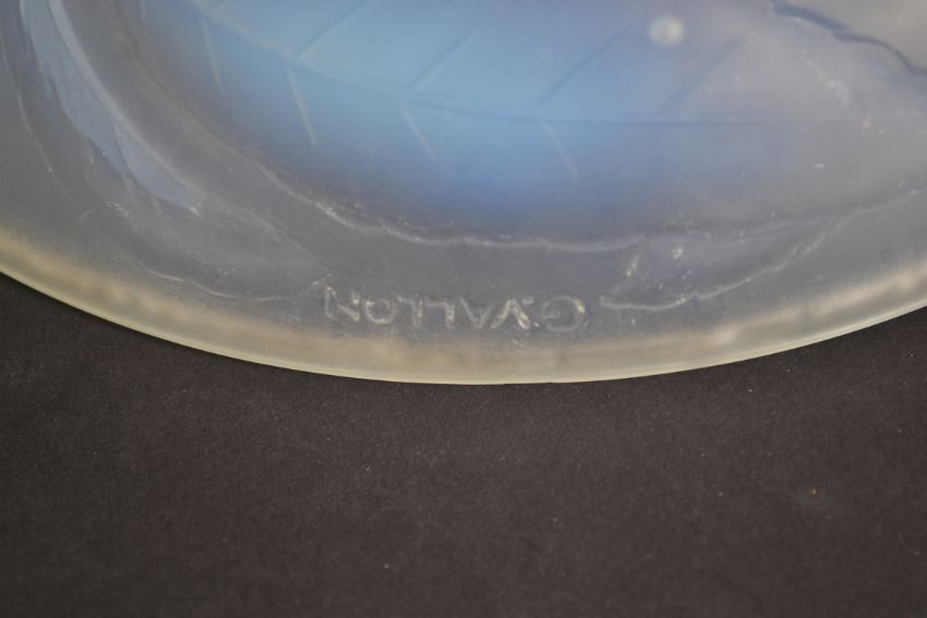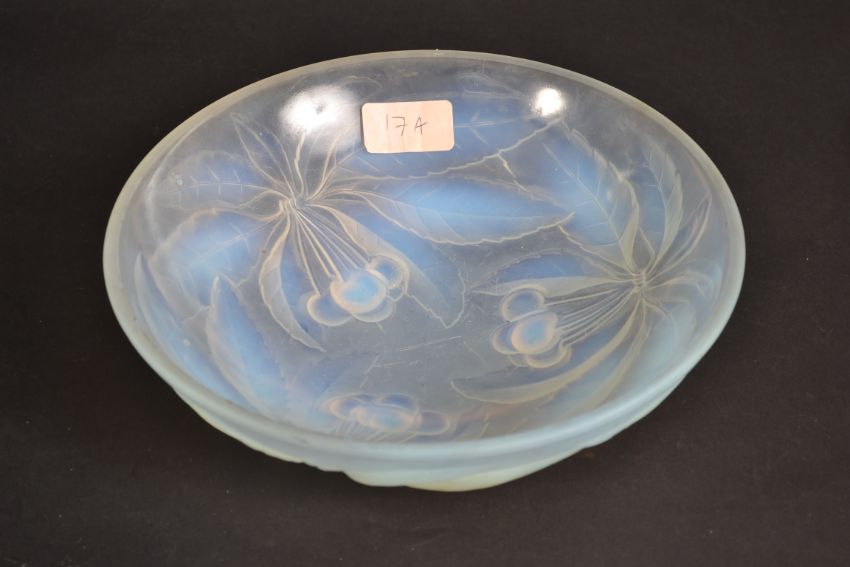 A vintage G Vallon French Art Deco opalescent glass bowl decorated with cherries, impressed G Vallon France.
