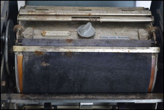 A vintage early 20th century portable metal cased printer by Roneo Vickers. Complete with the handle, the case with metal makers plaque. Measures 32cms high.