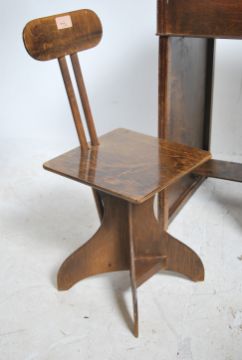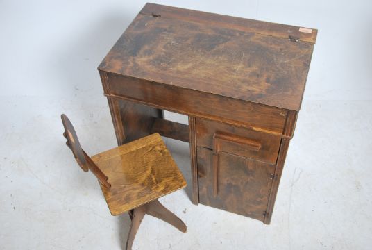 A mid century panel wood retro childs desk together with a fabulous childs ply wood office style desk chair. Measures 72cm high x 37cm wide x 59cm deep.