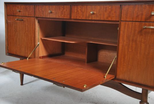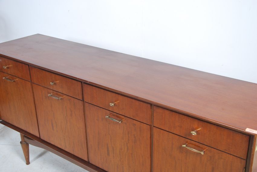 A good 1970's teak wood sideboard raised on a turned legs suspension set frieze base having a series of short drawers and cupboards to the wide body. Measures 83cm high x 171cm wide x 43cm deep.