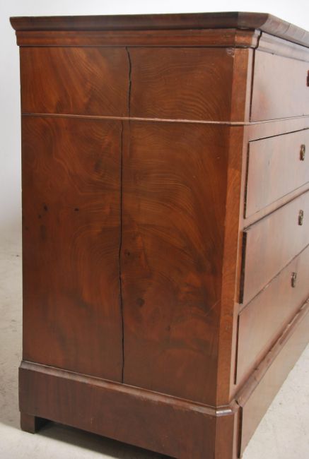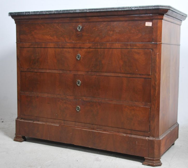A 19th century French flame mahogany and black/grey veined marble commode secretaire chest of drawers being raised on bracket feet supports with central bank of drawers, the upper drawer with appointed interior and fall front. All having brass key escutcheons. Atop a large flared black and grey veined marble top