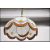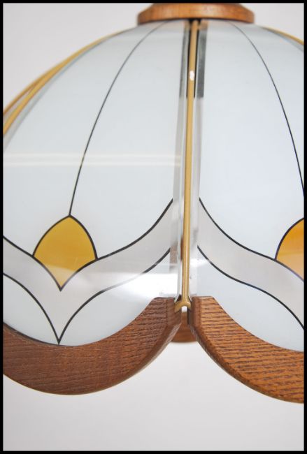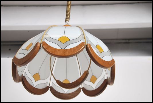 A pair of retro 1970's ceiling lights having frosted and colored glass half moon shades having oak finial tops with inverted arched shades, one panel af. Measures: 30cms high x 40cms wide.