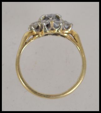 An 18ct gold and diamond ring having starburst mount, thecentre  diamond approx 50pnts total, surrounding diamonds approx 40pnts - total 90pnts approx.  Weight 3.8g / Size K.5