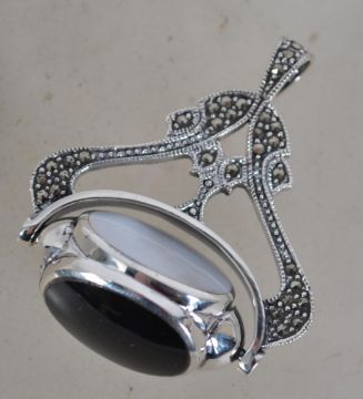 A sterling silver revolving fob inset with marcasites opal and onyx. Marked Sterling. Measures 5cms. Total weight 20.8g.