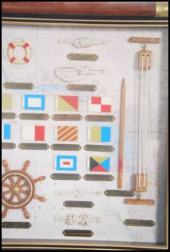 A Nautical themed wall mountable diorama display consisting of knots, ensigns etc presented within a glazed framed display. Measures 60cms wide.