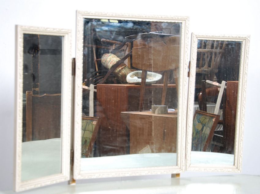 A mid century / 1950's kidney shaped painted dressing table having twin banks of drawers with curtain front and mirror atop. Measures 74cm high x 153cm wide x 84cm deep.