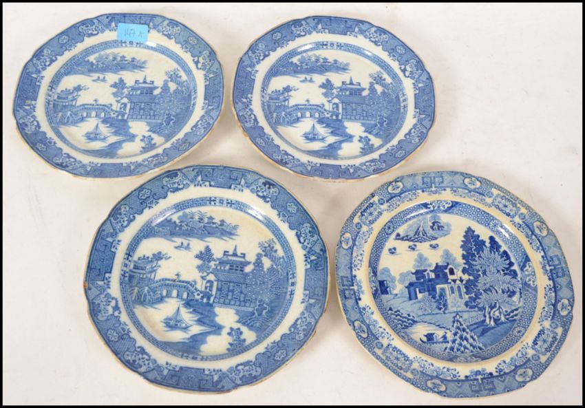 A collection of four late 18th century / early 19th century blue and white willow pattern plates. Measures 24cm wide.