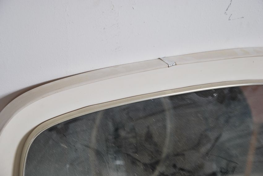 A 1950's white framed large retro mirror. The plastic sqaure, rounded edge frame with inset mirror glass