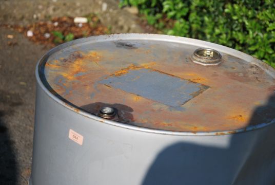 A retro 20th century large Industrial oil barrel with two tone grey and white colours having central notation.