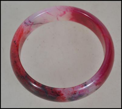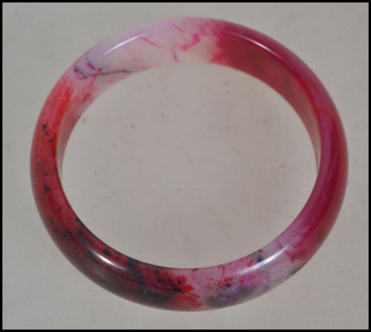 A Chinese Jade Bangle Bracelet, rose coloured stone carved in round tubular form