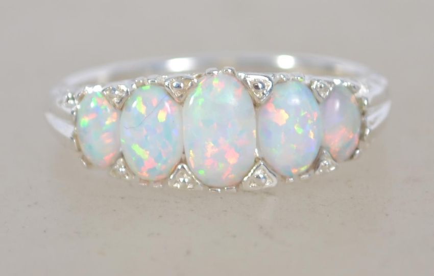 A silver five stone opal set ring. Size S.5. Total weight 3.5g. Marked 925.