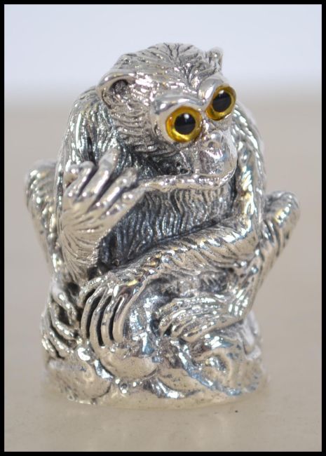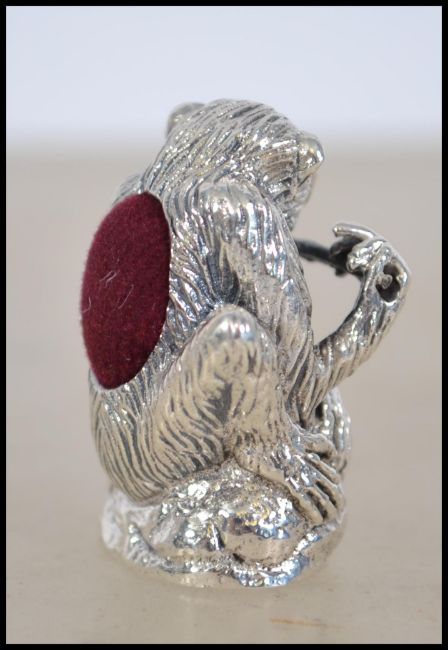 A silver pin cushion in the form of a monkey brushing his teeth with yellow stone eyes. Total weight 24g. Measures 3cms high.