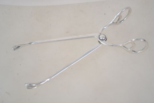 A pair of silver 800 marked DRGM sugar nips of simple fine form with twin fork ends and half moon shaped handles. Total weight 15.5g / Size 10.5cms long