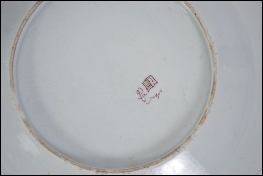 A group of Oriental ceramics to include an Armorial plate, a pair of black Japanese vases with gilt work design and a scalloped edge plate depicting traditional Oriental scenes. Vases measures 15cms high.