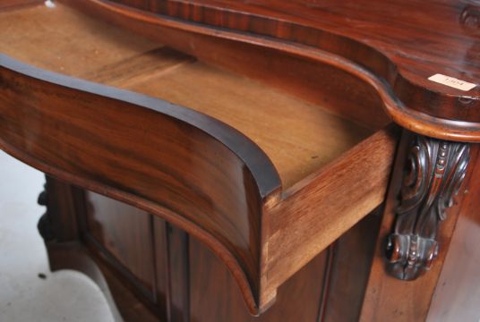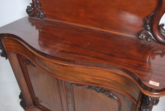 An excellent Victorian mahogany chiffonier sideboard being raised on a plinth base with twin door cupboard under wide drawer above. Finished with a scrolled work stage gallery upright back.Measures 155cms x 123cms x 46cms