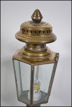 A pair of brass and glass table lamps stylised on 19th century street lamps. Having twist spiral stems raised on a circular bases, sectional glass shades. Measures 45cms high.