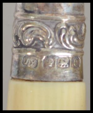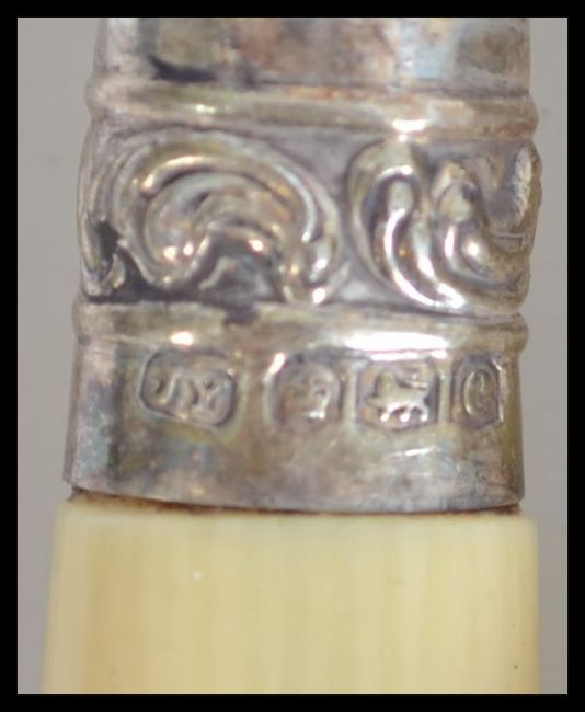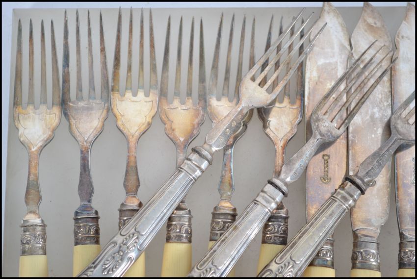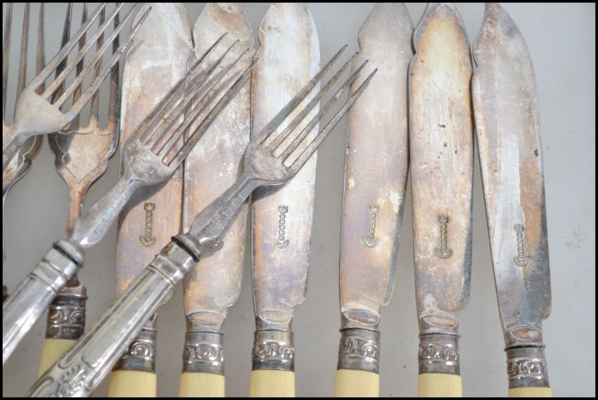 A six person setting of silver collared fish cutlery having ivorine handles. Please see images