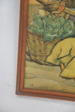 A retro mid 20th century print of pixies and fairies being framed and glazed in the manor of Brownie Downing. Measures 56cm high x 49cm wide.