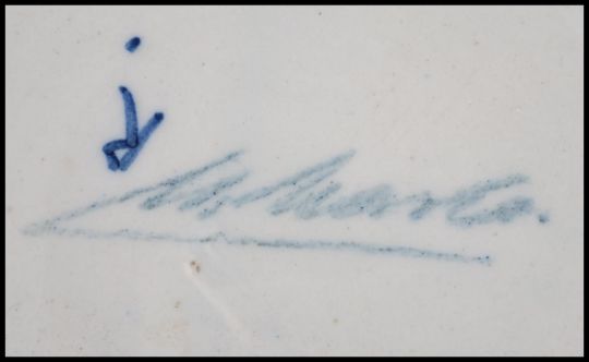 A pair of hand painted 19th century blue and white Delft plates, each with geometric design and with signatures to back