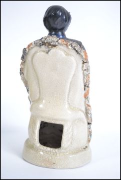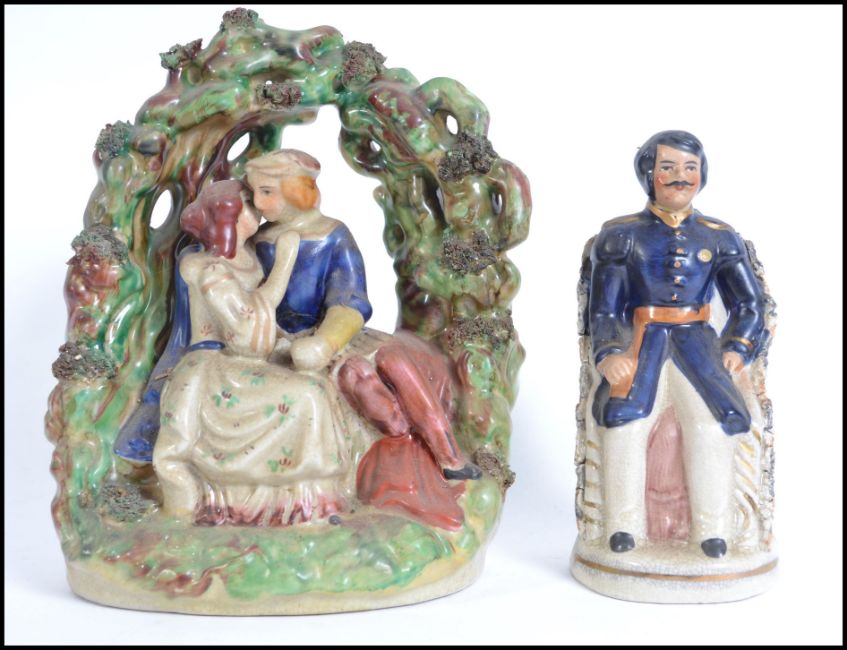 A Victorian Staffordshire flatback figurine with arch of trees over entwined lovers together with another flatback of gentleman in military uniform. Tallest measures 23cms high.