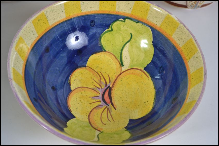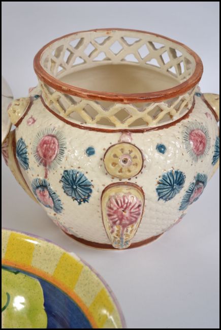 A group of ceramics to include large wash bowls and jugs, majolica vase with pierced rim and Bellini Italian bowl.