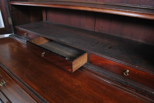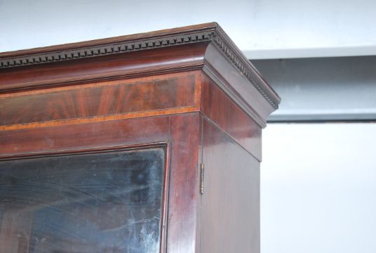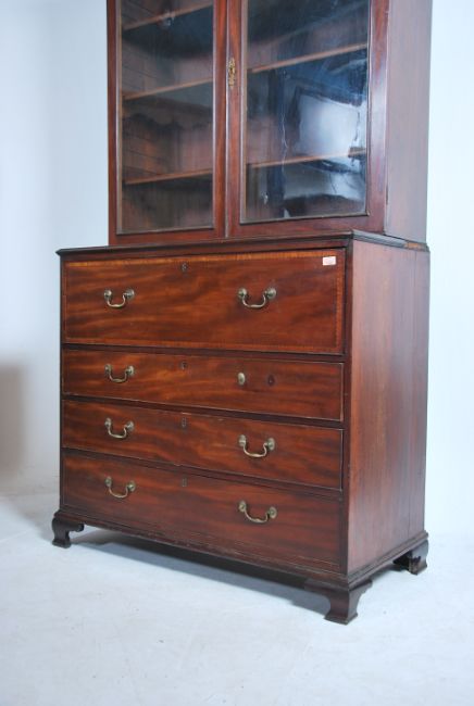 A 19th century Georgian mahogany inlaid secretaire - bureau bookcase. The large base with a chest of drawers under fall front pull out appointed desk. Inset leather writing skiver with sectional drawers etc within. Finished with an astragal glazed bookcase cabinet atop. Dismantles into 2 pieces for ease of movement. Measures 226cm high x 115cm wide and 56cm deep.