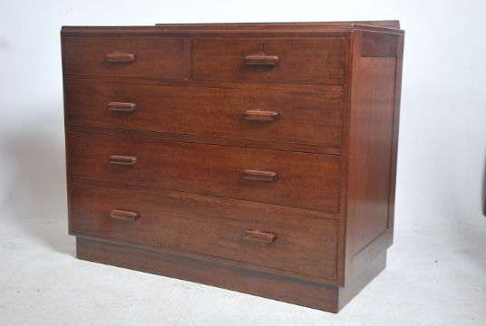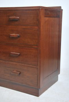 A 1940's Air Ministry mahogany chest being raised on a plinth base with a series of drawers having block handles. Marked to the back with AM crown and for Liss Brothers. Measures 88cm high  x 106cm wide x 53cm deep.