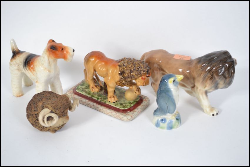 A collection of ceramic animals to include a 19th century style Staffordshire Lion, a Terrier dog, Penguin, Ram etc.Tallest 18cms high.