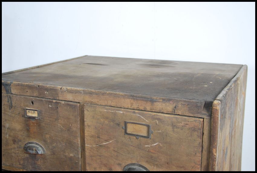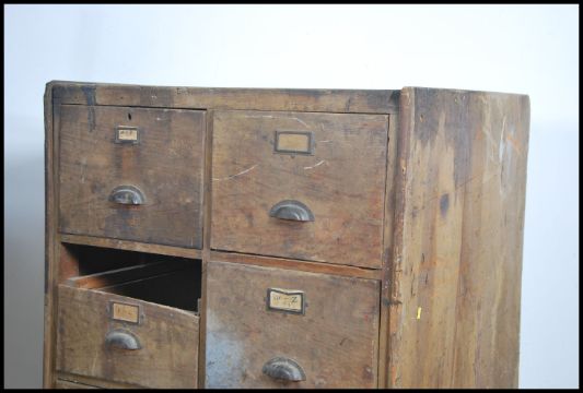 An early 20th century Industrial pine wood engineers 8 drawers workshop chest having half moon pulls and notation slides. Measures 131cm high x 84cm wide x 69cm deep.