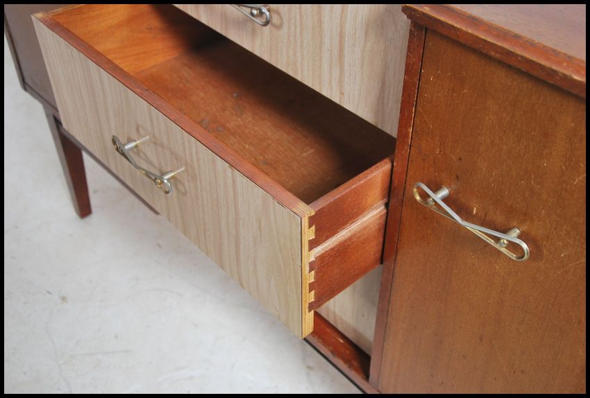 A retro 1960's Danish influence sideboard in teak being raised on tapered legs with two tone finish having drawers and cupboards. Measures 75cm high x 125cm wide x 39cm deep.