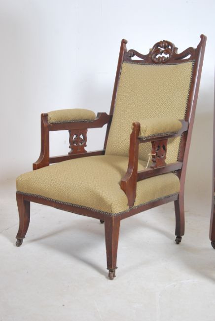 A Victorian mahogany ladies and gentleman's pair of library armchairs. Both raised on turned supports with  contemporary upholstery, the gents with upholstered elbow supports and the ladies with open frame. Measures 102cm high x 65cm wide and 80cm deep.