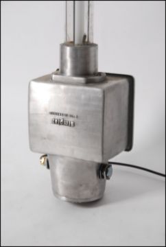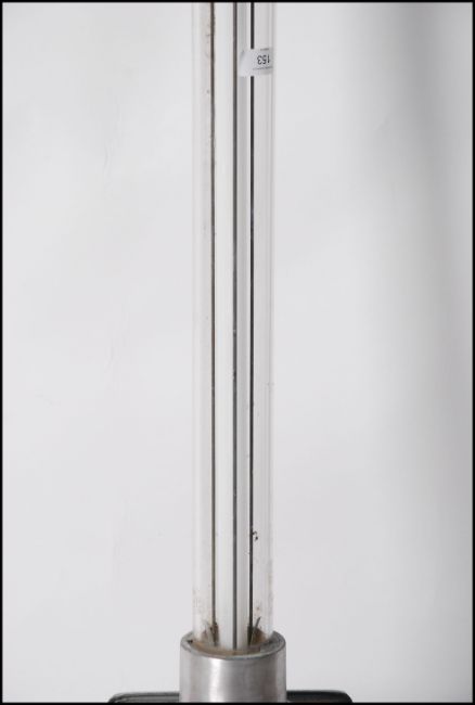 A large Industrial explosion proof floor standing - wall fit tube strip light. The large glass cylinder shade housing a tube light having a stunning large polished aluminium box mounted base. Originally from the British cellophane factory being rewired and ready to use. Measures(cm) Height 189. Matching 2nd in lot 1105