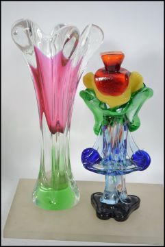 A retro 20th century Murano studio glass clown together with a possible Murano tri coloured heavy studio glass vase. Measures 37cms high and 30cms high.
