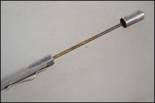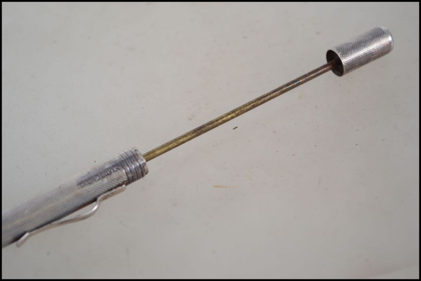 A sterling silver propelling pencil, having an engine turned design and marked sterling silver.