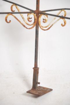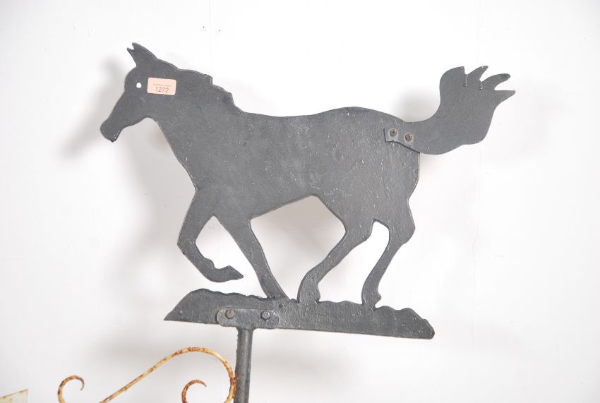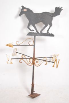 A large 20th century cast and wrought metal weather vane having north, east, west and south pointers mounted with a metal horse plaque top. Measures 120cm high x 88cm wide.