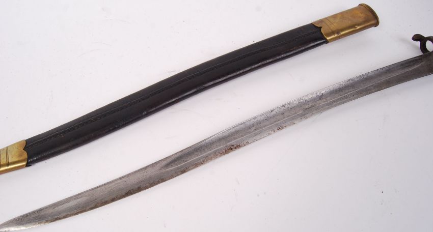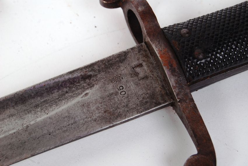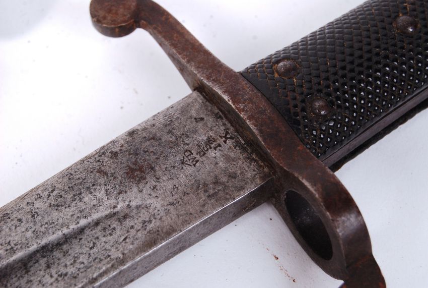 An early 20th century French Chassepot rifle bayonet. With scabbard and curved blade. Markings to recasse. 71cm long.