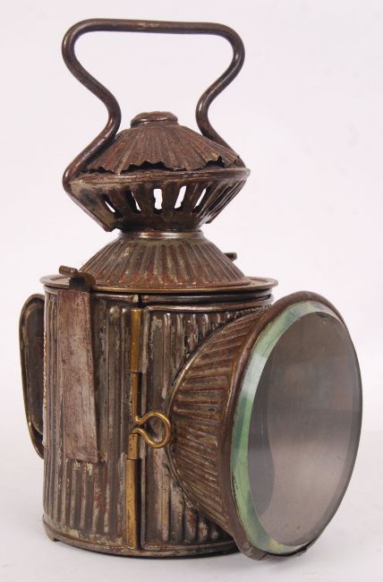 A good original Victorian / Edwardian early 20th century Messenger & Sons of Birmingham made Corrugated Lamp for use on the Rhymney Railway. Various brass plaques denoting its maker and railway company. Stamped to the base '236 RRCo'. 30cm tall.