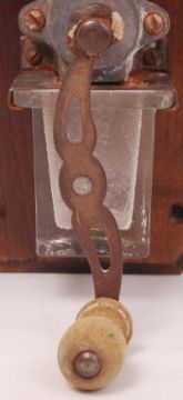 A 20th century Swastika & SS decorated wooden mounted wall 'Kaffee' (Coffee) grinder complete with glass measuring dispense pot to bottom.