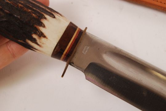 A large contemporary hunting knife, the blade and scabbard marked for Solingen of West Germany. With faux horn handle, and leather scabbard. 45cm long.
