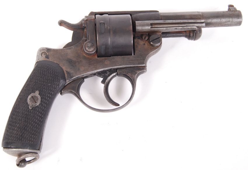 An antique 19th century French service six shot revolver / pistol. Model 1873, and dated 1876 Chamelot- Delvigne pattern. Manufactured and signed / engraved; Mre D'Armes St Etienne. Obsolete calibre .11mm. Legal to own without deactivation or license. Serial number G24971.