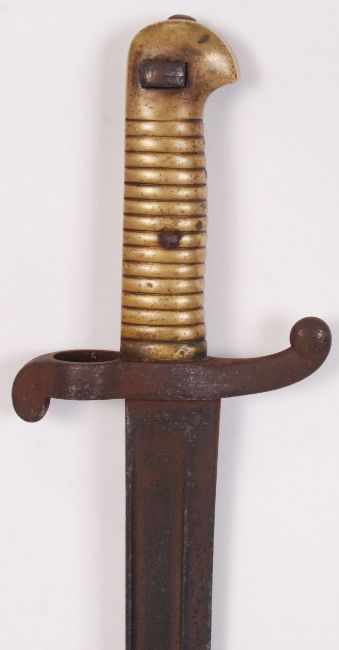 An antique French Yataghan rifle bayonet, with internal spring. C1842/59. Elongated shaped blade, with brass handle. 70cm long.