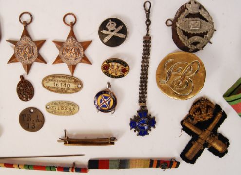 A collection of assorted WWI First World War and WWII Second World War militaria / medals etc. Comprising of a collection of uniform buttons, for various regiments. Two WWII 39-45 Stars, A Wound Stripe No.4, ribbons, Preacher's Dog Tag (G Dowson 52855), Insurance Company key fobs, a Dutch (likely silver) and enamel good service badge and chain and other similar items.