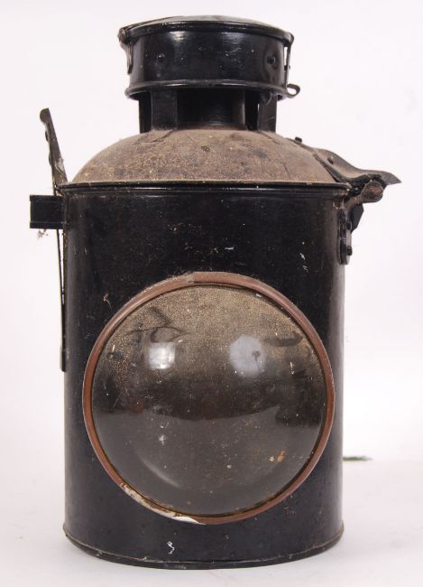 An antique early 20th century electric mountable railway locomotive lamp. With bracket to base, and circular glass lens to front. Locking lift up lid with vent to top. 33cm tall approx.