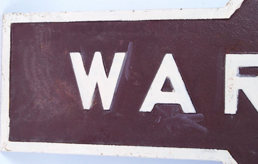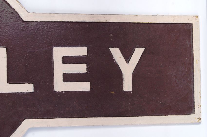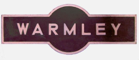 The original railway station sign from Warmley Station, Bristol. c1960's. Rectangular sides and central circle. Metal construction. Originally placed on the station platform at Warmley and removed when the station closed in 1966. Owned by our vendor ever since, the signs have formed part of a large private local railway collection. Was repainted shortly after removal, in the correct red and white colourscheme. Approx 121cm long The other sign featured in lot 100