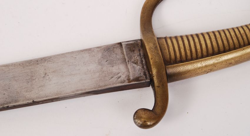 A 19th century French Briquet rifle bayonet. Brass handle, with scabbard. Marked with an 'F' within a shield, and 1443 to hilt. 74cm long.