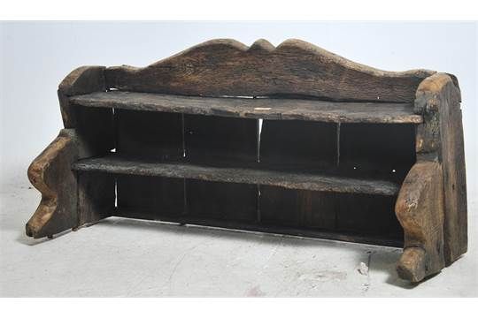 A believed 16th century elm wood dresser top gallery having stunning shaped shelves with exposed worm tracery and believed very old fire damage. Measures 53cm high x 105cm wide and 48cm deep.