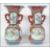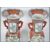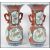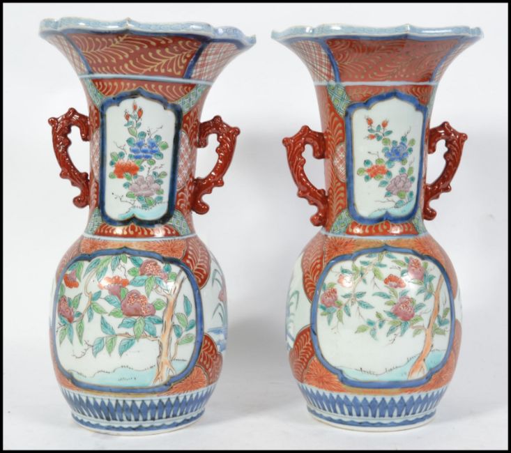 A pair of 19th century Chinese famille rose twin handled vases. Each with geometric red ochre panels with central foliate panels elsewhere. Twin scrolled handles to the waisted necks with trumpet tops. 6 ochre red character marks to the base. Measures 35cm high.