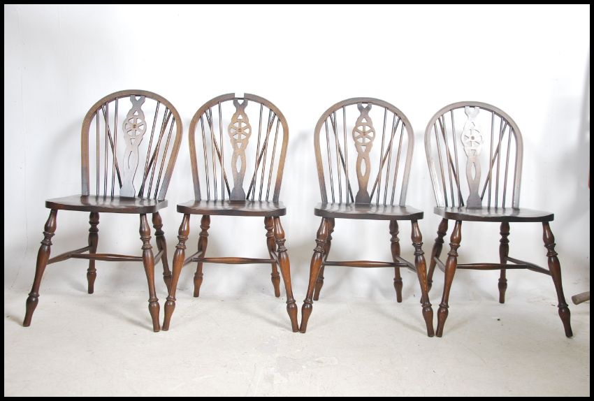 A set of 5 beech and elm wood wheelback dining chairs by Glenister Furniture. Of good quality with turned legs and stretchers, panel seats and wheelback rests. The set comprising 4 standard chairs and 1 carver