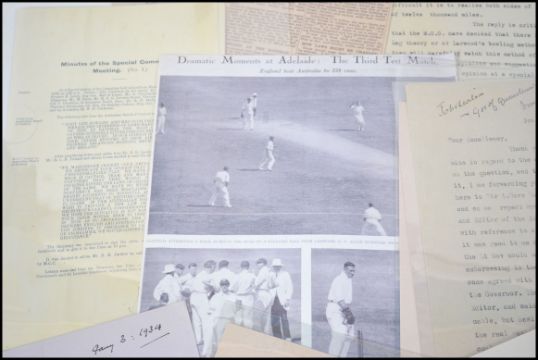 A collection of Cricket Memorabilia regarding the ' bodyline ' tour of 1932 - 1933 etc mostly reproductions.
